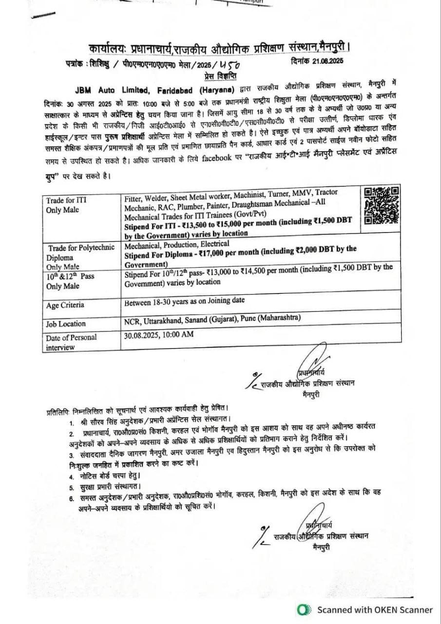 JBM Group Ltd Campus Placement 2025 | Fresher | ITI Pass | Apprentice | Faridabad Haryana |  30 August 2025 |